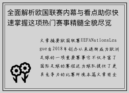 全面解析欧国联赛内幕与看点助你快速掌握这项热门赛事精髓全貌尽览